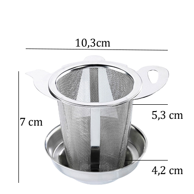 | Dimensions | Hauteur : 7 cm x Longueur entre les 2 ailettes en forme de théière : 10,3 cm x Diamètre haut du tamis : 5,3 cm x Diamètre bas du tamis : 4,2 cm |