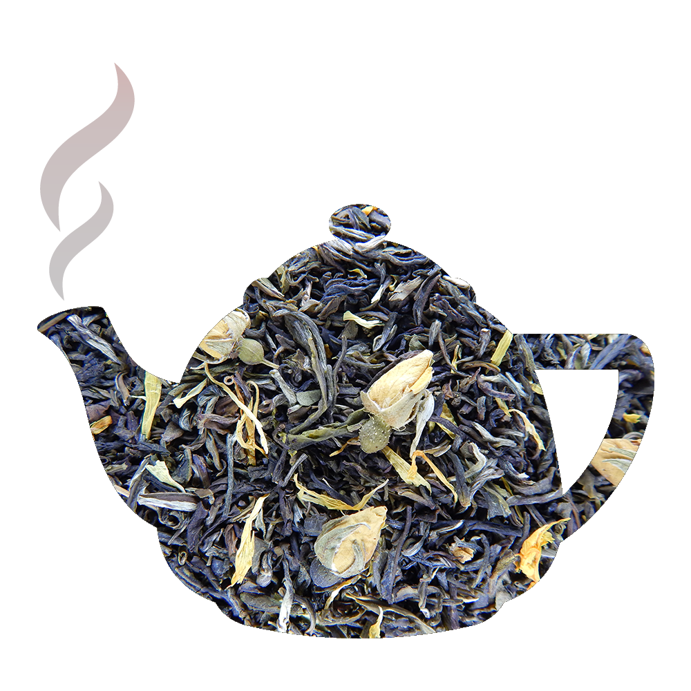 Thé blanc aromatisé pêche et abricot, boutons de rose et fleurs de souci.